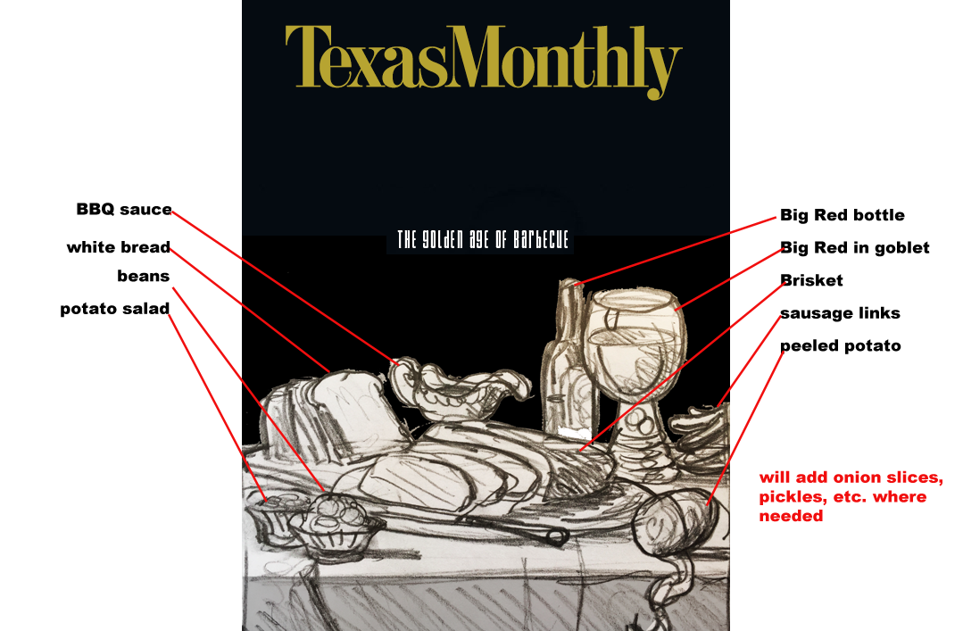 We agreed that they send me a "wish list" of items they'd like to see in the image—ranging from brisket, ribs, and sides to the classic Texas beverage of choice for BBQ, Big Red—and that I'd have a sketch for them when they arrived in the office Wednesday morning. In return, they'd get a quick approval with any edits so that I could begin final art by noon that day. I set to work roughing out a composition, which I sent to them for review when they got back in, and based on feedback I created a quick, more refined study that showed all the elements in place and the general composition.
